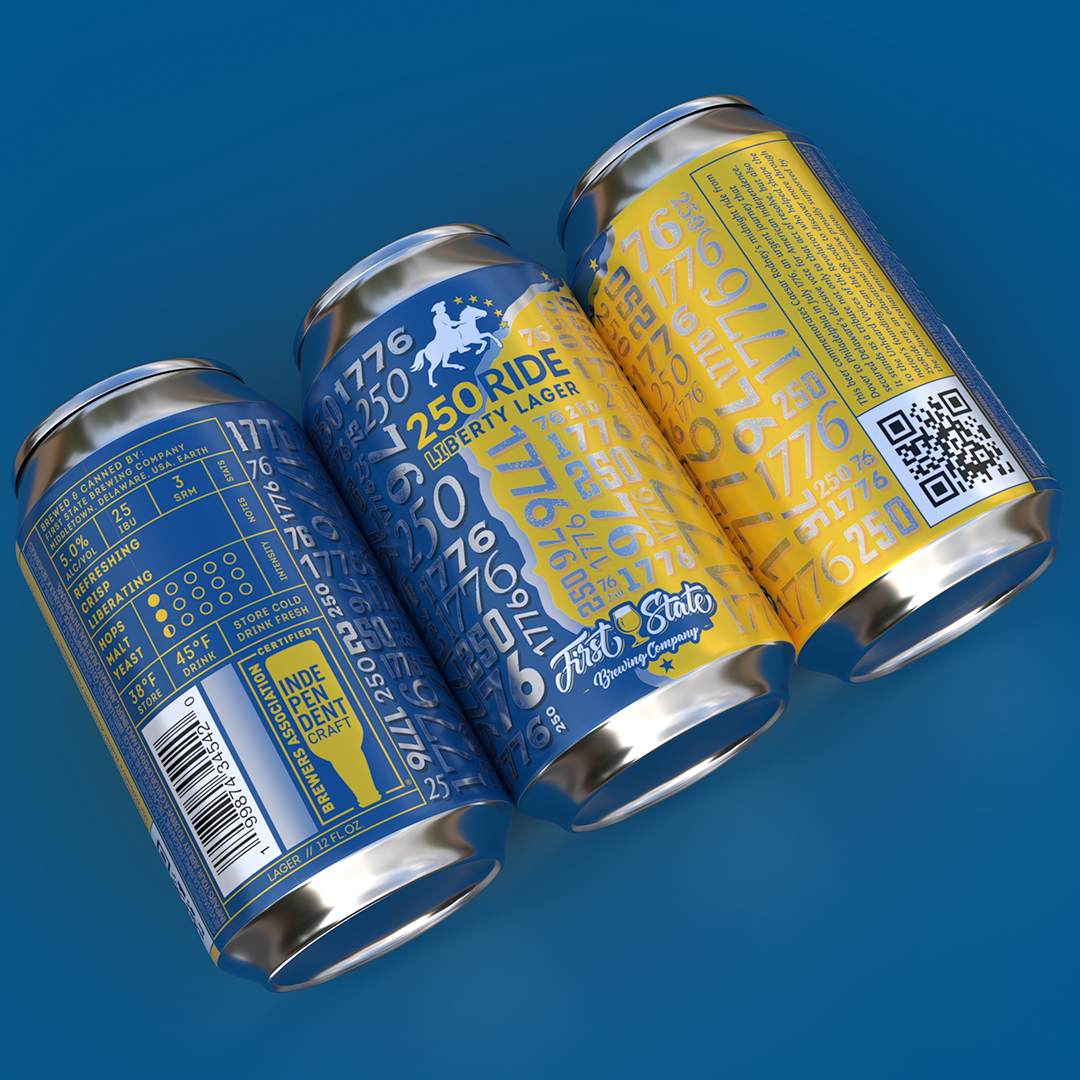 The can art for 250 Ride Liberty Lager was designed to reflect both the collaboration and the history behind it. Wrapped in blue and gold, the design draws from the colors of 250 Ride and the state colors of Delaware, creating a look that feels both celebratory and rooted in place.