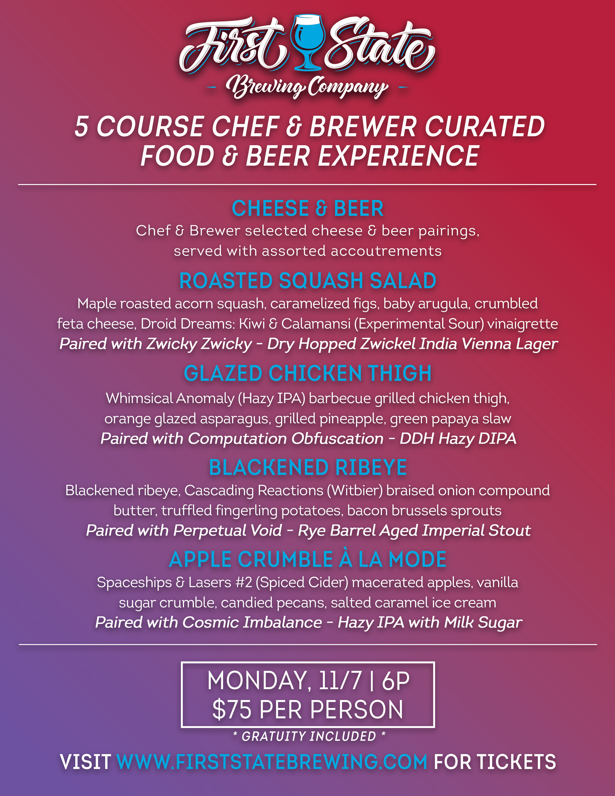Our 4th Chef & Brewer Curated Food & Beer Experience is right around the corner! This is not your typical beer dinner... Our Executive Chef, Nicholas Carr, has developed a delicious 5 course food menu which incorporates First State beer into all dishes. In addition, all of the courses are artfully paired with a diverse array of beer styles. This unique experience will be guided by Jeff Horne, Certified Cicerone®, who will discuss food & beer pairing concepts and how to properly taste beer.